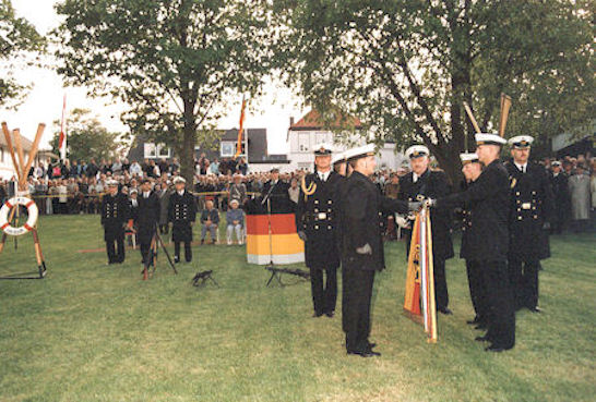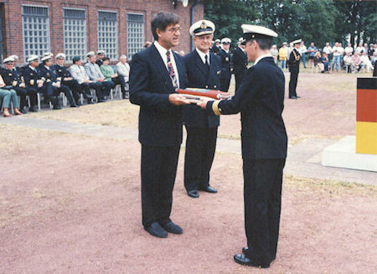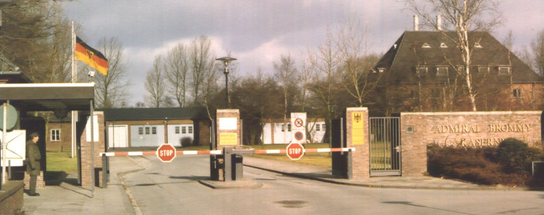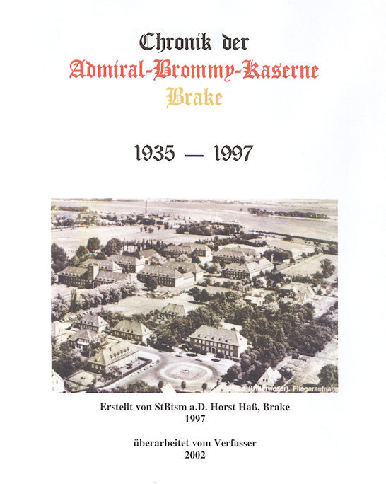 Fregattenkapitän Seele, letzter Kommandeur der Braker Marine-Einheit, übergibt bei der Abschlußmusterung die "Brommy-Flagge" (eine alte Traditionsflagge) an Brakes Bürgermeister Manfred Bergner. Interessierter Zuschauer (Bildmitte) war der stellvertretende Amtschef des Marineamtes, Flottillenadmiral Romer. Nach der Wiedervereinigung trat ich 1991 meinen Dienst beim Aufstellungsstab für die Marinetechnikschule (MTS) in Parow/Gemeinde Altenpleen (7 Km von Stralsund entfernt) an. Mit dem Jahreswechsel 93/94 wurde ich nach Rostock versetzt um am Umzug des Marineamtes von Wilhelmshaven nach Rostock mitzuwirken. Während der letzten Jahre meiner Marinedienstzeit in Brake sammelte ich Material und mit meiner Pensionierung verfasste ich die "Chronik der Admiral-Brommy-Kaserne" in Brake. Diese Chronik wurde im November 2005 vom Isensee-Verlag Oldenburg gedruckt. Das kleine Buch im DIN-A5-Format, mit vielen Fotos, hatte 40 Seiten und war im Buchhandel erhältlich. Die Chronik ist inzwischen leider vergriffen. Leider veröffentlicht der Verlag keine weitere Auflage.
